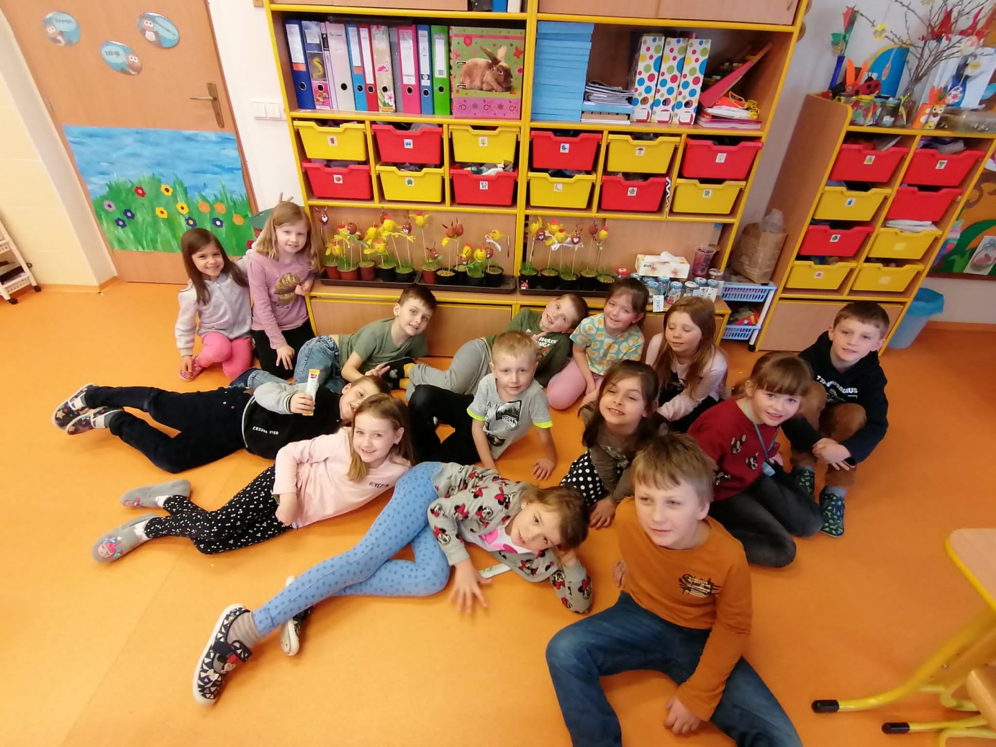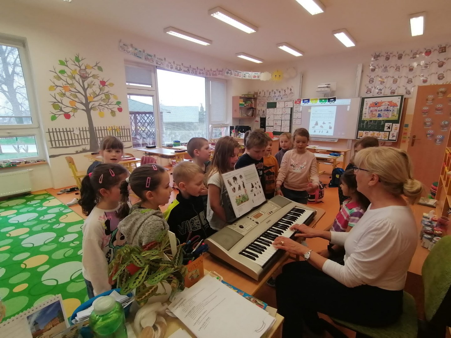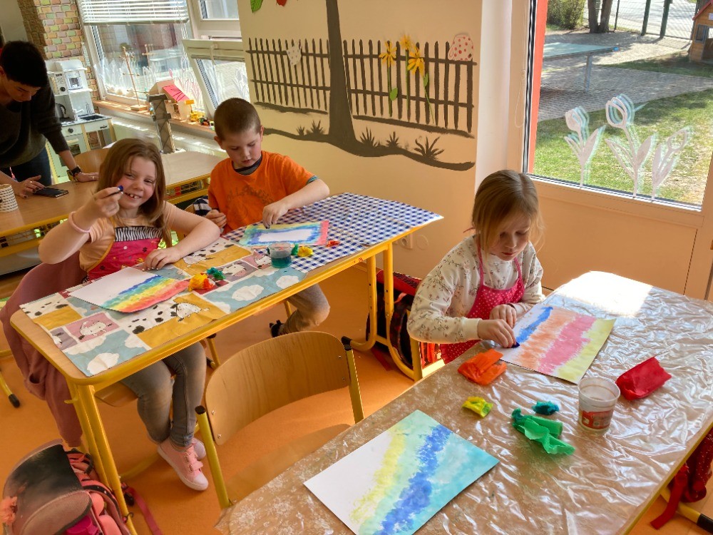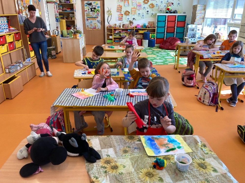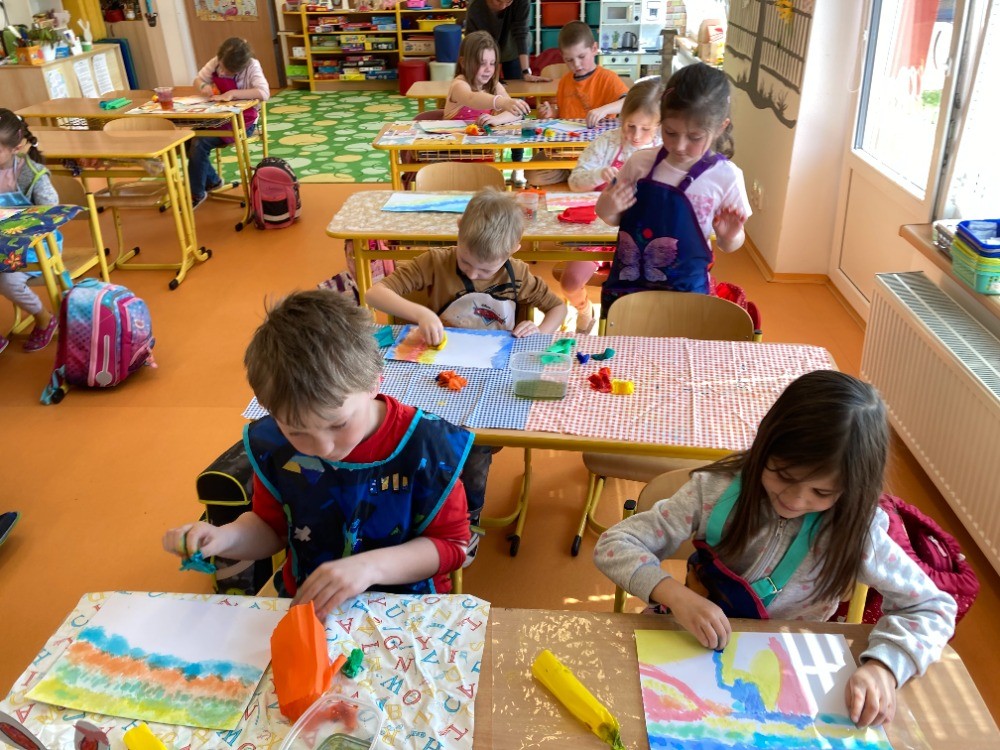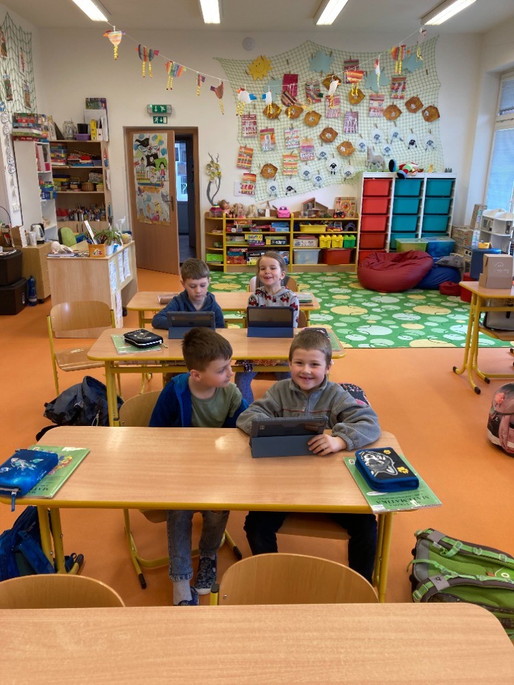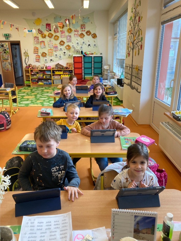 Ze života prvního ročníku - Velikonoční tvoření, vyučování matematiky na iPadu, hudební výchova, výtvarná výchova - zapouštění barev z krepového papíru.