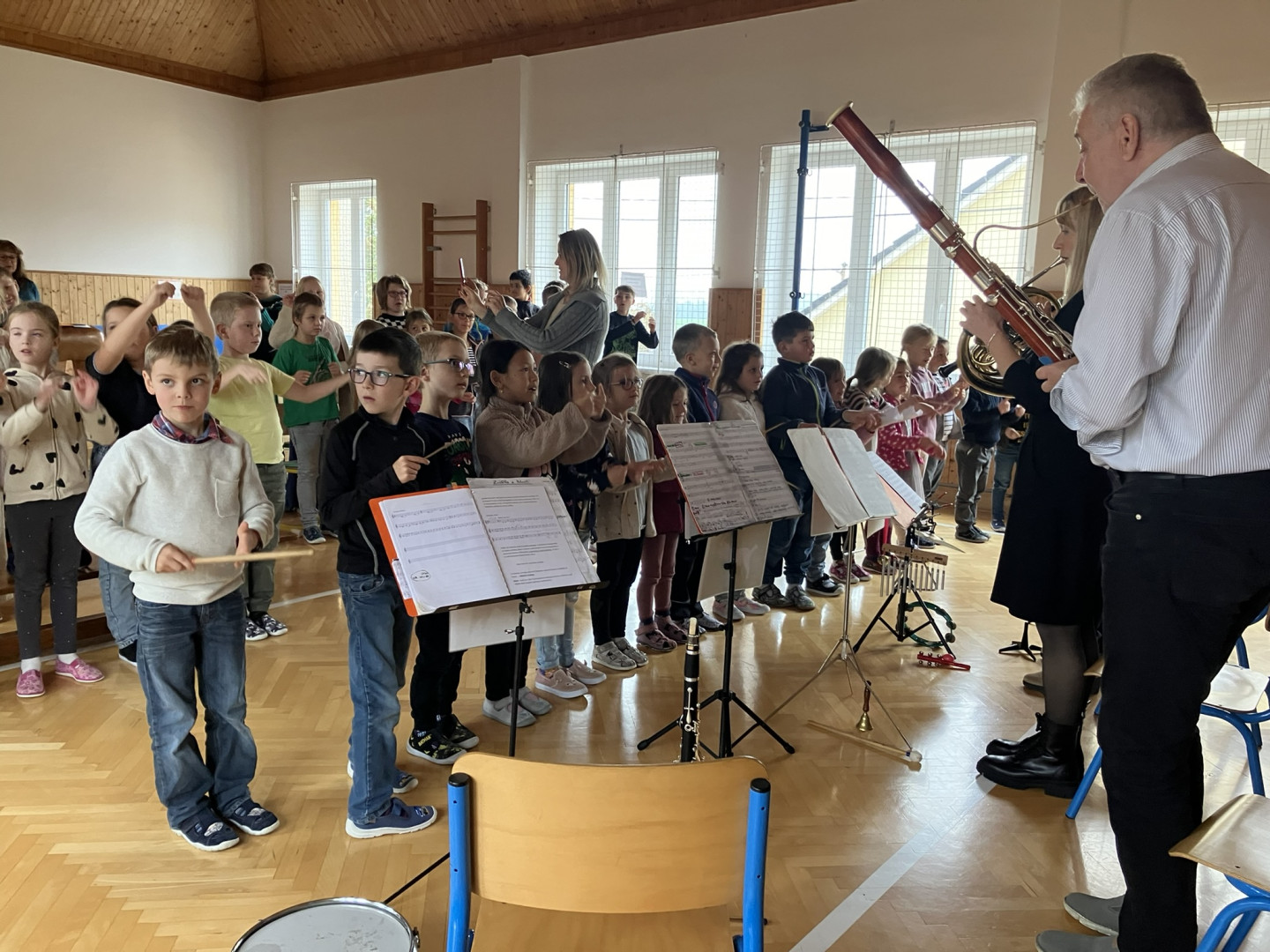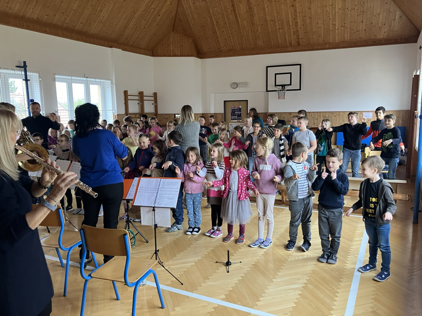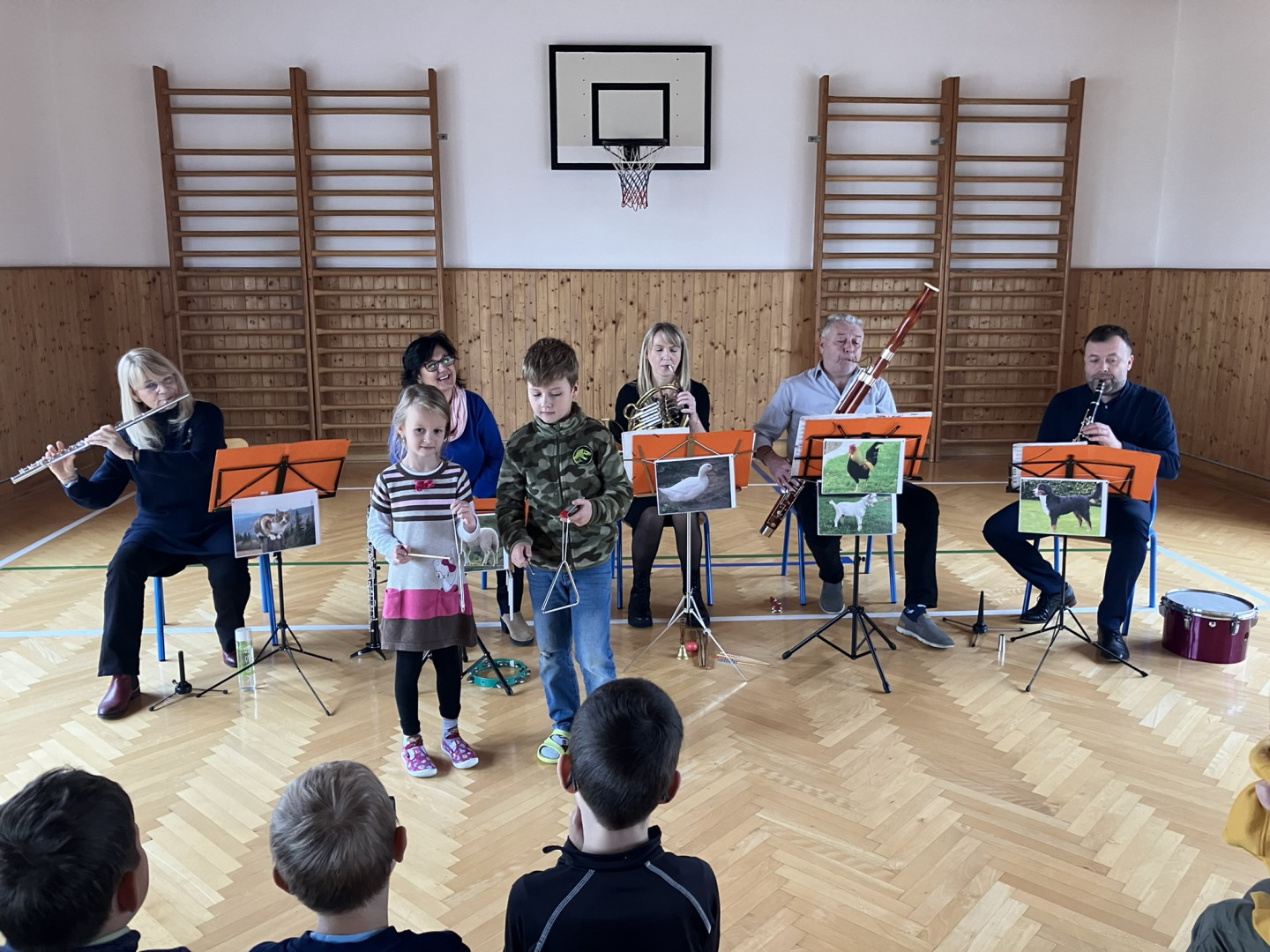 V pondělí 4. 11. jsme se sešli v tělocvičně školy k poslechu hudební pohádky Zvířátka a Petrovští. Přijelo nám ji zahrát dechové kvinteto z Hradce Králové. Hudebníci dětem poutavě představily své nástroje a během pohádky je zapojili také do zpěvu a dirigování.